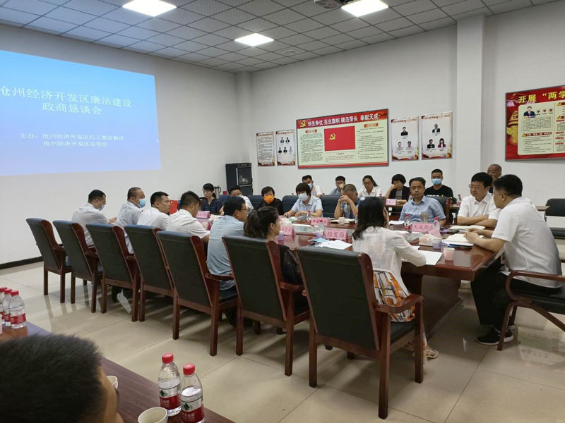 9月15日,滄州經濟開發區紀工委監察組、區總商會在河北天成藥業股份有限公司組織召開了醫藥行業廉潔建設政商懇談會,區黨工委委員,紀工委書記、監察組組長唐小明參加并講話。